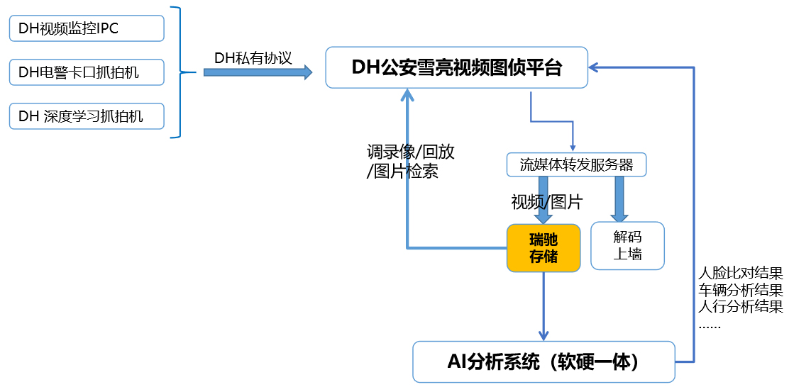 本項(xiàng)目部署11臺(tái)瑞馳分布式存儲(chǔ),主要存儲(chǔ)祁東雪亮工程的攝像視頻和抓拍圖片,拓?fù)浣Y(jié)構(gòu)如下。