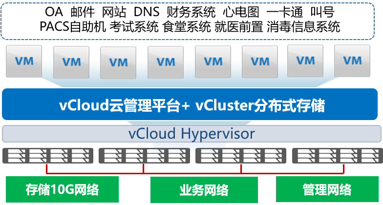 瑞馳根據(jù)醫(yī)院的業(yè)務(wù)需求,將醫(yī)療信息化軟件平臺部署在瑞馳vCloud超融合架構(gòu)上,以虛擬機(jī)的形式運行,能極大的提升硬件利用率、降低運維成本。同時,瑞馳超融合架構(gòu)支持萬兆互聯(lián)、副本機(jī)制、高IOPS和吞吐量等,在安全、穩(wěn)定的基礎(chǔ)上保障效率優(yōu)先。 此次建設(shè)的超融合平臺可以支撐醫(yī)院所有輔助管理系統(tǒng)的運行,后續(xù)根據(jù)業(yè)務(wù)需要,也可以隨時對超融合系統(tǒng)進(jìn)行擴(kuò)容,擴(kuò)容后將支持更多業(yè)務(wù)應(yīng)用。