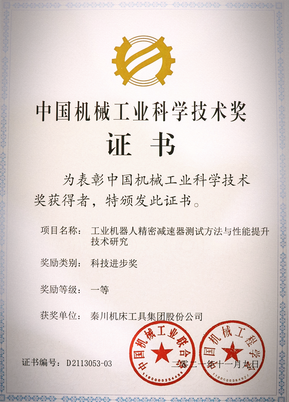 近日,中國機(jī)械工業(yè)科學(xué)技術(shù)獎(jiǎng)管理委員會(huì)公布2021年度中國機(jī)械工業(yè)科學(xué)技術(shù)獎(jiǎng)獎(jiǎng)勵(lì)項(xiàng)目,秦川機(jī)床工具集團(tuán)股份公司參與申報(bào)的“工業(yè)機(jī)器人精密減速器測(cè)試方法與性能提升技術(shù)研究”項(xiàng)目榮獲中國機(jī)械工業(yè)科學(xué)技術(shù)獎(jiǎng)一等獎(jiǎng)(科技進(jìn)步獎(jiǎng))。