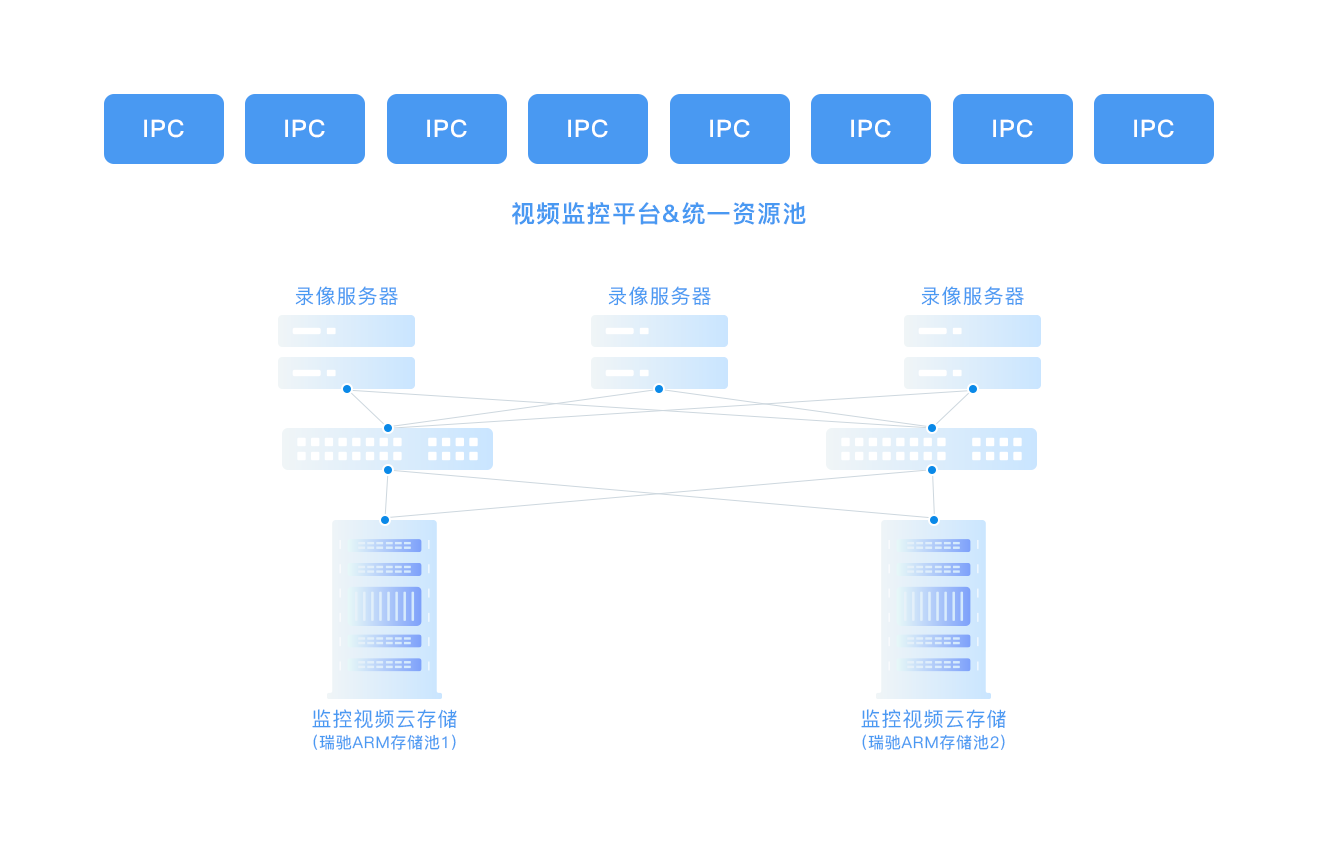 瑞馳提供業(yè)界創(chuàng)新的微集群視頻存儲解決方案,項目通過部署多臺Nxcells高密度低功耗分布式存儲,與X86機頭服務(wù)器結(jié)合,組成“冷+熱”存儲池?!袄涑亍敝忻?個NxCell存儲刀片作為一個“微集群”。視頻寫入冷池時,僅部分“微集群”是活躍的,剩下的不活躍的微集群則處于硬盤休眠狀態(tài),這樣大幅節(jié)省功耗并提高硬盤壽命。一個微集群寫滿,即進入休眠狀態(tài),下一個微集群被喚醒…… 此方案既滿足視頻云大容量存儲,又保障前端數(shù)千上萬路攝像頭的正常寫入。高密度低功耗Nxcells存儲比X86服務(wù)器降低50%的運營電力消耗,為企業(yè)節(jié)約機柜租賃設(shè)備維護費用可達40%。